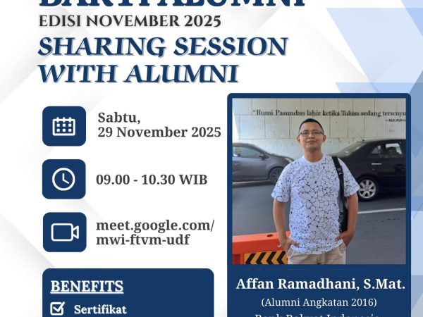 FMIPA Unsoed telah melaksanakan kegiatan Bakti Alumni secara virtual pada hari S abtu, 29 November 2025. Kegiatan dibuka oleh Korprodi Matematika (Prof. Dr. Idha Sihwaningrum, M.Sc.St.) dengan peserta dari kalangan..