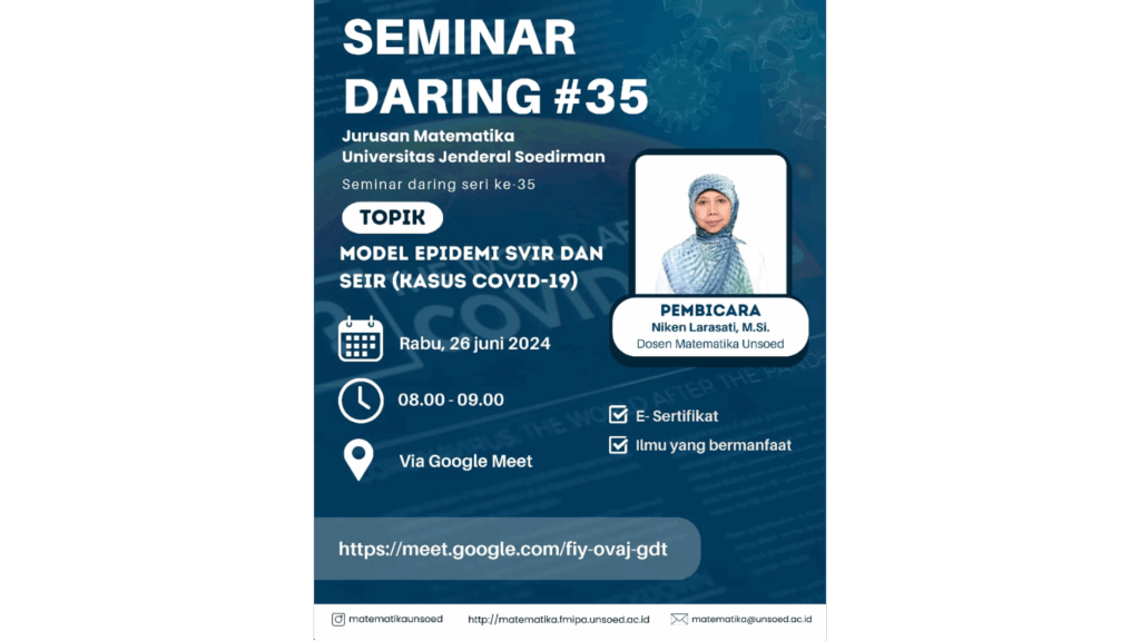 Dalam masa pandemik covid19, ketika dosen dan mahasiswa tidak aktif menjalankan perkuliahan di kampus, maka Jurusan Matematika Unsoed melakukan terobosan kegiatan melalui seminar daring rutin. Kegiatan ini melibatkan empat labotarorium yang ada di Jurusan Matematika Universitas Jenderal Seodirman secara bergantian. Keempat laboratorium tersebut adalah Laboratorium Statistika dengan Ketua Drs. Budi Pratikno, M.Stat.Sci., Ph.D., Laboratorium Matematika Terapan dengan Ketua Drs. Drs. Wuryatmo A. Sidik, M.Sc., Ph.D., Laboratorium Aljabar dan Analiis dengan Ketua Bambang Hendriya Guswanto, M.Si., Ph.D., dan Laboratorium Komputasi yang diketuai oleh Dr. Jajang, M.Si. Seminar daring rutin ini berlangsung atas dukungan penuh dari Ketua Jurusan Matematika Unsoed, Dr. Idha Sihwaningrum, M.Sc.St.