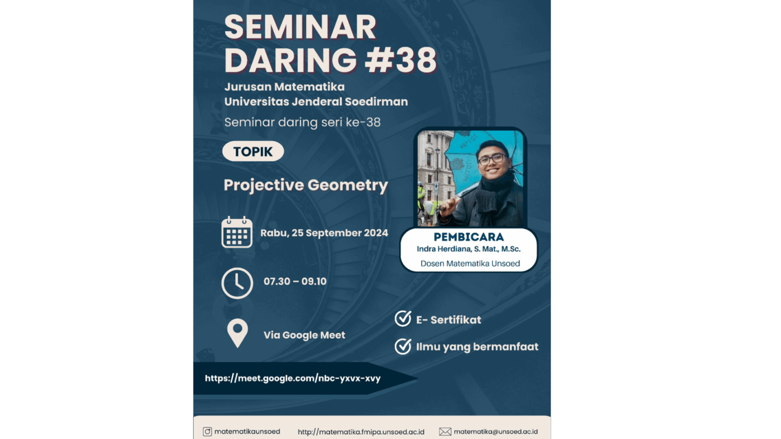 Pada hari Sabtu, 7 Mei 2023, Jurusan Matematika Fakultas Matematika dan Ilmu Pengetahuan Alam Universitas Jenderal menyelenggarakan acara Bakti Alumni dan Pembukaan Dies Natalis Matematika Ke-24 pukul 08.00-10.55 WIB yang dilakukan secara offline di Aula FMIPA Unsoed. Acara ini dihadiri oleh 108 peserta, 11 Dosen dengan tema “Strategi Membangun Potensi Diri untuk Mempersiapkan Karir dan Daya Saing Matematikawan Muda”.