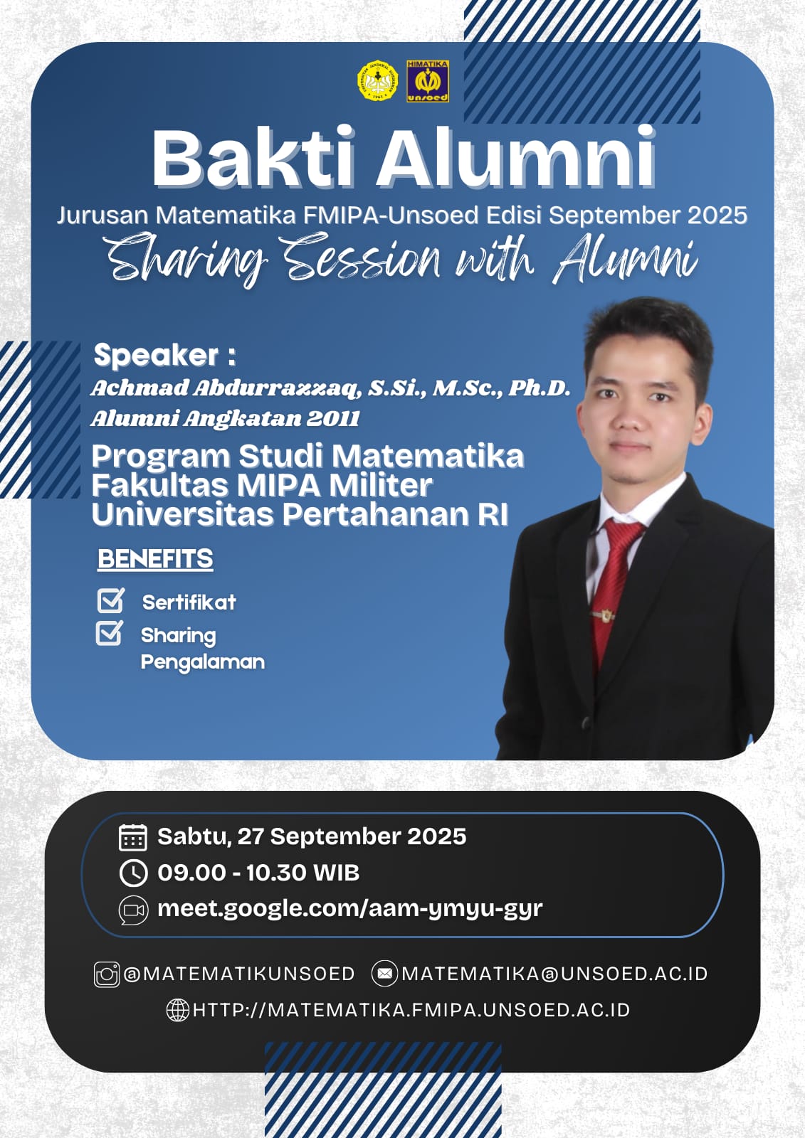 Sabtu, 27 September 2025 Jurusan Matematika FMIPA Unsoed telah melaksanakan kegiatan Bakti Alumni secara virtual. Kegiatan dibuka oleh Ketua Jurusan Matematika (Prof. Dr. Idha Sihwaningrum, M.Sc.St.) dengan peserta dari kalangan dosen, alumni maupun mahasiswa Jurusan Matematika Unsoed. Tujuan kegiatan adalah sebagai ajang sharing pengalaman alumni ketika masih kuliah dan dalam dunia kerja, sehingga dapat memberikan gambaran kepada mahasiswa bagaimana memasuki dunia kerja pada saat lulus. Kegiatan Bakti Alumni Edisi September 2025 menghadirkan pembicara Achmad Abdurrazzaq, S.Si., M.Sc., Ph.D (Alumni Matematika 2011) yang bekerja sebagai dosen di Program Studi Matematika, Fakultas MIPA Militer, Universitas Pertahanan RI.